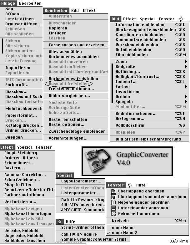 des Programms GraphicConverter 4.0 (93 kB). GraphicConverter ist Shareware - d.h. von regelmässigen NutzerInnen wird ein Betrag von EUR 28.00 erwartet. Lemkesoft wirft alle paar Monate eine neue Version auf den Markt (aktuelle Version 4.4.4). Für eingetragene UserInnen ist das Upgrade kostenlos. Neu gibt es ein gedrucktes Handbuch. Wer den Betrag bezahlt, kann einige Funktionen nutzen, die für Intensivnutzer von grossem Vorteil sind, zB. von vielen Fotos mit beliebiger Grösse Thumbnails von maximaler Höhe und maximaler Breite herzustellen ist eine Sache von wenigen Sekunden - auch wenn es 100 Bilder sind.