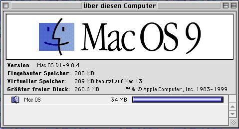 Klassen-Websites wird aktualisiert! An den Klassenwebsites könnt ihr weiter arbeiten. Einige Klassen haben die Umfrage schon ausgefüllt. Ihr könnt aus den Antworten entnehmen, wer auf der Klassensite mit seiner eMail-Adresse verlinkt werden möchte. Das geht so: 1. Namen markieren, dann Link aktivieren 2. Ins Linkfenster schreibt ihr: mailto:xy@zzz.ch --- wichtig: alles aneinander, keine Leerschläge dazwischen. Was möchte die Klasse noch auf ihrer Seite? Wie können wir das umsetzen und organisieren? Algemeine Aufrüstung 1. An unserer Schule ist seit letztem Mittwoch der ADSL-Router eingerichtet. Es funktioniert soweit gut. Testet es noch aus. Der Download zeigt bei guten Serverbedingungen, dass mit 35 - 40 kb/s gedownloadet werden kann. Das ist alleweil 5 x schneller als mit ISDN. Ich möchte aber noch in Erfahrung bringen, wie es ist, wenn alle Maschinen tüchtig am Werkeln sind. 2. Die iMacs haben nun alle 288 MB RAM (32 MB + 256 MB), das reicht für die nächste Zeit. Im Maximum können wir 2 x 256 einbauen. Wir können nun mehrere Programme parallel problemlos offen halten, ohne immer mit Abstürzen rechnen zu müssen. Das bedingt aber auch, dass wir den Programmen mehr Arbeitspeicher zuteilen müssen. Die 5500 haben 96 MB RAM (=32 MB + 64 MB), auch eine Steigerung von den bisherigen 64 MB. Ein 64er für die 5500er ist fast doppelt so teuer wie ein 256er für die iMacs!!! 3. Alle Maschinen haben nun System 9.0.4 geladen. Bevor wir nach Mac OS X (02/03?) wechseln, bleiben wir dabei. Never change a running team! Die wichtigsten Informationen erhälst du, wenn du im Finder links oben via >Apfel >Über diesen Computer anklickst.